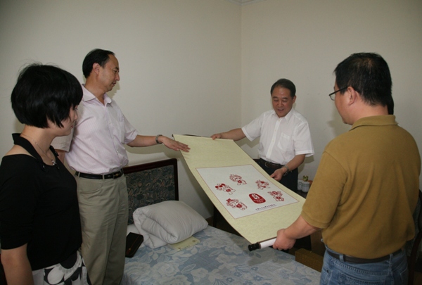 8月25日,校黨委書記孫堯東、副書記盧思鋒到學校外事樓看望了浙江賽會志愿者的領(lǐng)隊浙江團省委副書記徐旭一行,并贈送了由我校志愿者親手制作的剪紙福娃。