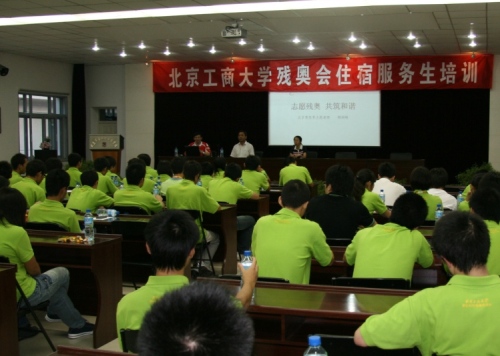 韓潤峰從殘奧會的起源及歷時、殘疾人參與殘奧會所經歷的階段、北京殘奧會的相關知識、殘奧會服務生應注意的問題等四個方面做了全方位的詮釋和講解。他強調,要想做好殘奧會的服務工作首先是要有端正的態度,要有不怕苦、不怕累,樂觀向上的心態,要樹立做一名合格的殘奧會服務生的信心。此次培訓韓潤峰副處長是帶病堅持,而沙啞的嗓音和不時的咳嗽并沒有影響他細致到位的講解和同學們聆聽學習的熱忱。