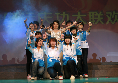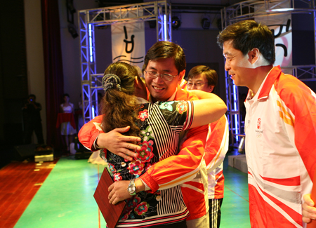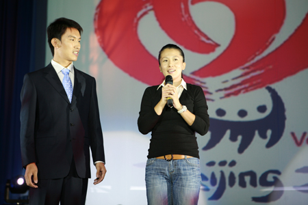 我國首位冬奧會冠軍楊揚在主席臺上同志愿者互動