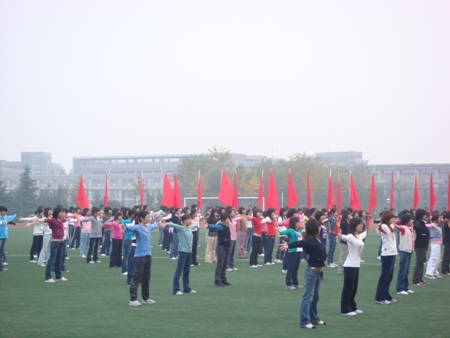 數理系的老師們也為運動會準備了廣播操表演,那一定也不遜于年輕人的表現。整齊劃一的動作,嚴肅認真的神情也讓大家為之贊嘆不已。讓我們為數理系鼓掌歡呼,讓我們迎著奧運風波走上運動場,揮撒我們青春靚麗的風采,展現我們自信張揚的個性。