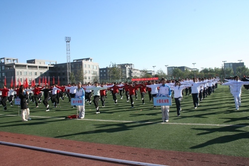 10月24上午,秋高氣爽,陽光高照,在學校第六屆運動會的開幕式上,來自20個基層工會的590位教工參加了學校第一屆教職工廣播操表演賽,這是北京工商大學組建以來舉辦的第一次大規模的教職工廣播操比賽。
