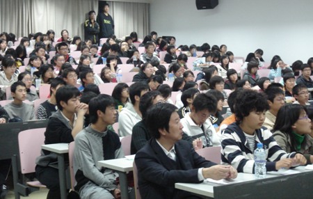 劉世生教授多年從事英語文體學(xué)和英語語言學(xué)的研究工作,深有造詣。此次講座圍繞語言意義、內(nèi)涵與風(fēng)格問題對同學(xué)們進行了講解。講座內(nèi)容主要分為語言理論、修辭用法、問題及討論等幾個方面,劉教授引用了大量實例及切身經(jīng)驗向同學(xué)們解釋了語言學(xué)豐富的內(nèi)涵。講座爆滿,同學(xué)們感到受益良多,對當(dāng)今國際形勢下中西方的文化差異有了更進一步的認識和了解,同時,英語學(xué)習(xí)愛好者也明確了學(xué)習(xí)外語的重要性和努力的方向。期間,會場氣氛熱烈,同學(xué)們踴躍提出各種問題并得到劉教授的親切解答。