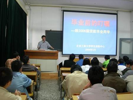 針對國家助學貸款的性質和特點,我們特別注重貸前審核和貸后管理,重點加強對貸款畢業生還款手續的業務指導和季度付息前的信息提示,從2004年起,我們以院系為單位,為貸款畢業生開辦《畢業前的叮囑》講座共35場,就現代社會個人信譽的重要意義、國家個人征信系統建設狀況、可能造成違約的八種情況以及解決辦法向學生進行詳細的介紹。為方便學生進行貸款業務咨詢和償還貸款本金的學生聯系辦理《畢業證書》更換手續,我們公布了個人手機電話,幾乎每晚6點從良鄉回到阜成路校區以后我們都要先回到辦公室,為學生辦理取證手續。有的學生平時不能請假、有的學生受同學委托、有的學生從外地趕來又要馬上返回……只要是學生需求,不管是周末還是節假日,“綠色通道”總會在這里延續。