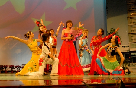“五十六個民族,五十六枝花;五十六族兄弟姐妹是一家…”熟悉的旋律又一次縈繞耳邊,熟悉的感覺又一次激蕩胸懷.每一個音符,都詮釋著中華民族的友愛.身著各組民族服飾的舞者們輕盈躍動,和著明快的歌聲,舞出了民族的團結,舞出了民族的和諧,更舞出了校園中的和諧音符。
