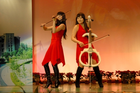 “火焰組合”憑借著青春的吸引,夢想的力量為臺下的觀眾帶來了一場提琴“風暴”。鮮紅的服裝,優雅的提琴,動感的樂曲,這一切都讓恰逢少年的同學們能接受了一次音樂“風暴”的洗禮,現場的氣氛和著音樂舞動。她們是來自中國電影廣播樂團的青春組合。