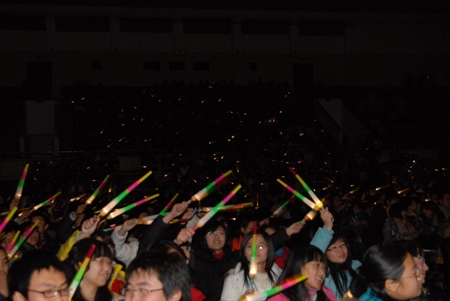 走出會場的每一位觀眾仿佛還都沉浸在歡樂之中,說著,笑著。快樂的時光好像那么的短暫。文體館外,天橋上的彩燈不斷的變換著顏色,照亮了每一個人的笑臉。不知不覺中,一輪新月掛上了天空。歡樂的笑聲和優美的校園夜景仿佛預示著供工商大學將會迎來一個更加美好的2009年。