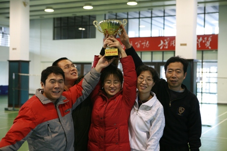 學校第三屆教工羽毛球比賽12月29日進行了決賽階段的比賽并舉行了頒獎儀式。機械工程學院榮獲北京工商大學羽毛球協會冠軍杯,黨委副書記兼紀委書記、羽毛球協會名譽主席張德玉,工會韓寶龍為冠軍杯獲得者和各單項成績前四名獲得者頒獎。