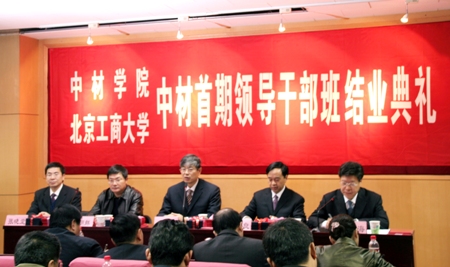1月7日,中國中材集團委托北京工商大學繼續教育學院舉辦的中國中材集團領導干部培訓班結業典禮在我校西區舉行。李朝鮮副校長與中國中材集團總經理譚仲明、黨委書記于世良出席結業典禮并向學員們頒發了結業證書和優秀學員證書。