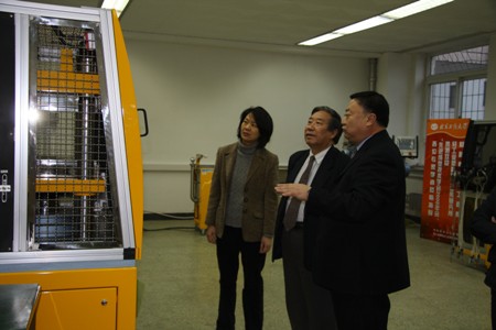 在材料系(塑料所)主任兼所長許國志及班子成員的陪同下,他參觀了系(所)實驗室。在聯合國援助的brabender設備前他長久駐足,這是二十多年前他組建實驗室時,德國贈送的設備,如今仍維護如新;在看到中日兩國政府地膜項目日方贈送的設備運轉完好時,他勉勵材料系(塑料所)要在為中國塑料工業發展作出貢獻和取得成績的基礎上,更上層樓;在聚合物基礎性能試驗室,他參觀了技術水平屬國際一流的哈克流變儀,詳細詢問了設備的性能和使用情況,當他聽到本科生都能使用這樣的設備做實驗時,他非常感觸今非昔比,認為,近年來,材料系教學科研的儀器設備數量增加了,質量提高了,他建議這里要進一步建設成為行業培訓的基地。