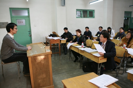 9:00整,黨委書記孫堯東、校長譚向勇走進面試會場,傾聽招聘問答、詢問面試情況、慰問工作人員、回答記者提問。他們從西區到東區,視察了每個面試會場,與應聘者交談、與志愿者握手、與評委交流、向保安員頷首。我們還看到,在招聘黨務工作人員面試會場,黨委副書記盧思鋒和張德玉擔任評委;在招聘教輔和管理工作人員面試會場,副校長孫寶國和李朝鮮擔任評委。