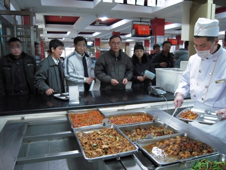 隨后,王尚忠帶頭刷一卡通買飯,大家邊品嘗菜品,邊征求附近就餐師生的意見。餐后,王尚忠召集大家就調研情況發表意見。他談到:飲食中心能夠針對東區食堂菜品味道問題進行及時整治,這種做法是好的,值得提倡。菜品味道有所改善,但與西區食堂相比還有距離,還需要進一步改進。希望食堂能夠在菜品味道上狠下功夫,在廣泛征求廣大師生意見的基礎上,不斷改進菜品質量,辦成師生滿意的食堂。