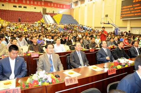 黨委副書記盧思鋒致辭,他代表學校黨委和行政向大家致以節日的問候和良好的祝愿。他指出,五四運動既是提倡民主與科學,解放思想的偉大文化運動,又是反帝反封建的偉大政治運動,在中國歷史上具有極為重要的意義。五四運動雖然已經過去90年了,但五四運動所體現的精神、所開創的傳統意義仍然重大,影響仍然深遠。他強調,紀念五四運動并不僅僅是文藝演出,更應該繼承并發揚五四運動的光榮傳統。他對學生的成長提出了五點要求:第一,要高揚愛國主義旗幟。第二,要積極投身于建設中國特色社會主義偉大事業。第三,要堅定對馬克思主義指導、共產黨領導和科學社會主義道路的信念。第四,要遵循深入實際、聯系群眾的方向,在實踐中鍛煉成長。第五,要持續培養優良的學風、校風,努力學習,健康成長,發奮成才,報效祖國;大力弘揚奧運精神,大力開展志愿活動,勇于奉獻,服務人民;努力加強道德修養,提高文明素養,做到“和諧校園,人人有責”、“校園和諧,人人共享”;全面提升自身的綜合素質,承擔時代賦予的歷史使命,努力為推進中國特色社會主義貢獻智慧與力量。