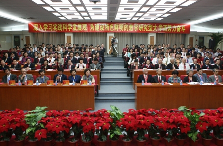 孫堯東最后說,60年的歷史積淀為學校實現(xiàn)科學發(fā)展奠定了堅實的基礎,10年組合為學校實現(xiàn)科學發(fā)展凝聚了巨大的力量。我們要大力更新觀念,加強規(guī)范管理,加速學校轉型,爭取實現(xiàn)學校兩年大調(diào)整,五年大變樣,十年實現(xiàn)奮斗目標。讓我們繼續(xù)高舉中國特色社會主義偉大旗幟,更加緊密地團結在以胡錦濤同志為總書記的黨中央周圍,在中共北京市委、市政府的領導下,同心同德,發(fā)奮圖強,求真務實,加快發(fā)展,為把學校早日建設成為特色鮮明的教學研究型大學而努力奮斗!