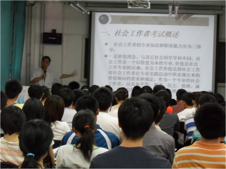 林永和教授指出社會工作是社會建設的重要組成部分,它是一種體現社會主義核心價值理念,遵循專業倫理規范,在社會服務、社會管理領域,綜合運用專業知識、技能和方法,幫助有需要的個人、家庭、群體、組織和社區,整合社會資源,協調社會關系,預防和解決社會問題,恢復和發展社會功能,促進社會和諧的職業活動。社區工作者應當具備管理學、經濟學、法律等多學科的知識體系,具備正確的人生價值觀,有高度的責任感和使命感。他認為考試成功的關鍵則在于知識的積累,學生平時應該注重相關學科知識的綜合理解和應用,考試時隨機應變。