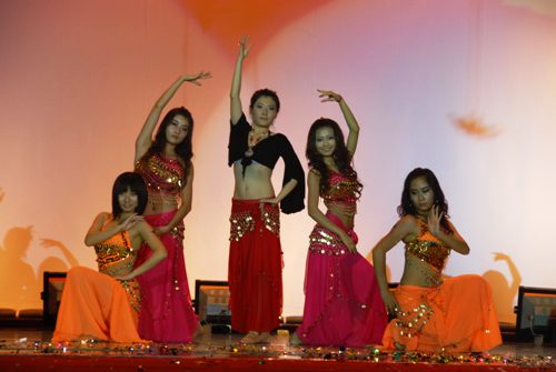 在“5、4、3、2、1”在倒計時聲中,晚會正式拉開了帷幕。799樂隊帶來的熱場歌曲 《knocking on heaven’s door》迅速點燃了現場氣氛,將大家的血液燃燒到沸騰?;盍λ纳涞慕治?、充滿異域風情的肚皮舞、動感十足的花式籃球表演、溫情動人的05級畢業班合唱將晚會現場氣氛一次次推向高潮。