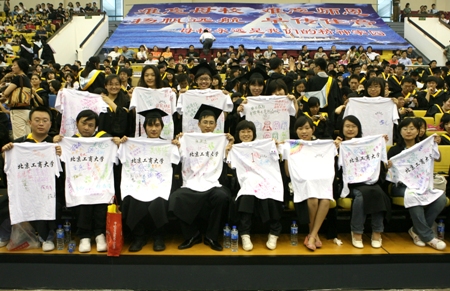 6月18日,對于北工商來說是個不尋常的日子,因為05級的同學即將畢業離開校園。身著學士服的畢業生在校園里成了一道亮麗的風景線,方型黑色學士帽的穩重,帽檐搖曳的流蘇,三角兜式的垂布邊沿鑲嵌著粉色文學的睿智、黃色工學的豁達、灰色理學的嚴謹。三三兩兩的畢業生,或合影留念,或一起嬉笑,或在林蔭下路上尋找過去的回憶,都在以不同的方式慶祝畢業。一張張照片讓時空定格在這美好的一瞬,但是記載不下畢業生對學校的深切眷念,有同學說“真想把學校也打包帶走”。