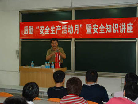 安全講座由綜合服務中心主任蔣藏忠主持,保衛處處長頓勁松結合后勤工作,作了后勤安全生產常識及消除隱患的報告,他從后勤日常工作中的安全問題、安全防范意識和措施、重大安全事故及責任、安全生產、交通安全等5個方面,詳細講述了安全工作的重要性和怎樣落實安全生產,并現場示范滅火器的使用方法,教會大家正確使用滅火器。