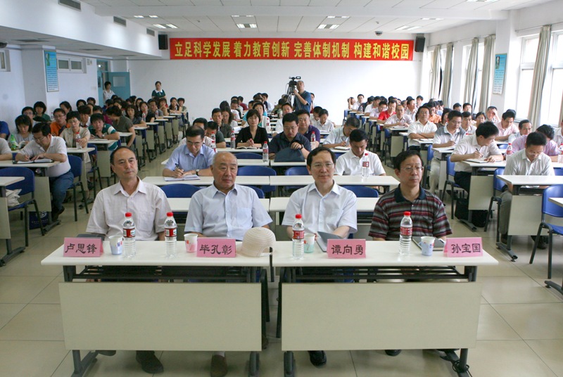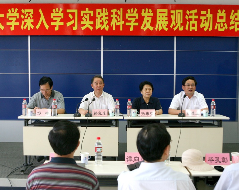 按照學校學習實踐活動的總體安排,7月10號,我校在阜成路校區教三樓351隆重舉行深入學習實踐科學發展觀活動總結大會。市委第20指導檢查組組長張來芬、副組長鄧峰,成員馬景娜、王朋信、魏凱,市委教育工委聯絡員畢孔彰,校領導孫堯東、譚向勇、盧思鋒、張德玉、孫寶國、謝志華、李朝鮮、王尚忠、張耘出席大會。全體中層干部、教授、黨政秘書、黨代表、教代會代表、民主黨派基層組織負責人、離退休同志代表、學生代表等參加會議。大會由黨委副書記兼紀委書記張德玉主持。