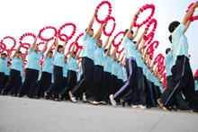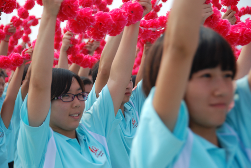 今天是三伏的第二天,高達35攝氏度的炎熱天氣成為參訓師生面臨的最大挑戰。在合練還未開始時,汗水便已經浸濕了許多人的衣背。但是酷熱的天氣沒有使參訓師生的熱情減退,一張張笑臉綻放在訓練場上,以高昂、飽滿的精神狀態迎接領導的檢閱。與前一次合練不同的是,參訓師生通過主席臺時需要配合毛主席的講話發出歡呼。激情的呼喊配合著歡樂的笑臉,青春的氣息在訓練場上顯露無遺。此外,我校國慶方陣的整體水平也有了極大提高,整齊的排面、洪亮的口號聲、有節奏的揮舞花環呈現在領導面前。在場的領導和老師們的陣陣掌聲是對我校國慶方陣最好的鼓勵與肯定。