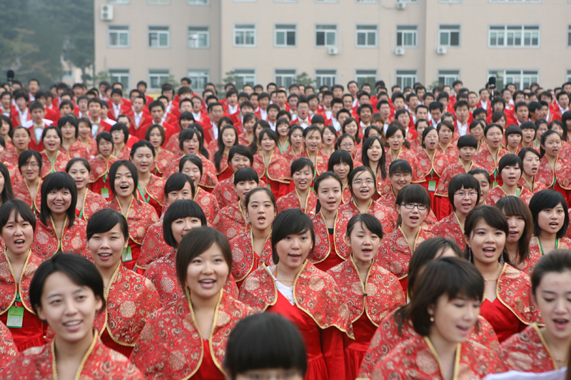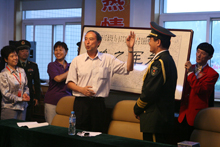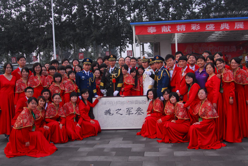 9月27日下午,距國慶閱兵、群眾游行還有三天之際,校黨委副書記盧思鋒同志率我校廣場合唱團80名師生再次來到閱兵村,與首都各高校、中小學(xué)合唱團員同并肩奮戰(zhàn)三個月、結(jié)下深厚友誼的解放軍聯(lián)合樂團官兵們進行國慶60周年大典前的最后一次合練。