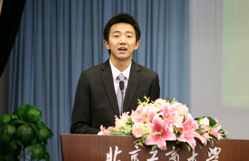 隨后,五名在國慶訓練期間分別肩負不同任務的老師、同學分別作為參訓教師、方陣中的學生、合唱團隊、廣場聯(lián)歡團隊及后勤保障團隊的代表上臺做了發(fā)言。發(fā)言當中,既有教師為同學送鞋赤腳走過長安街的感人瞬間,又有同學們雨中訓練、長途跋涉的不畏艱難,還有各部門工作人員為保障國慶任務順利完成所做出的巨大貢獻。代表們真摯的話語感動了在場每一位老師和同學。