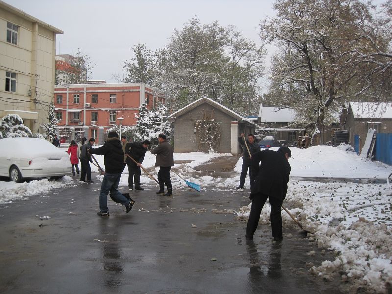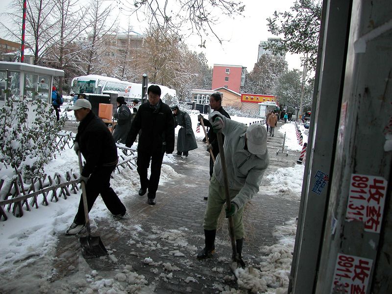 早晨上班后,后勤處副處長尹寶星和后勤各部門辦公室的工作人員,也都陸續投入到掃雪隊伍中,大家從凌晨掃雪的同志手中接過掃把、鍬等工具,接替掃雪工作,以便讓他們吃早飯,暖和一下身體。校門口值班的保安也一同幫助掃雪,阜成路校區共有100多人參加了早上的掃雪。