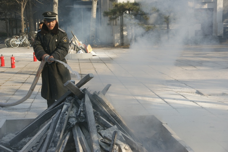 會后在東區(qū)學(xué)生公寓前,頓處長示范了干粉滅火器的使用方法,全體參訓(xùn)教工很有興趣地進行了演練,掌握了滅火器的使用方法。接著在場保安又進行了水用消防栓、消防帶的使用演習(xí)。
