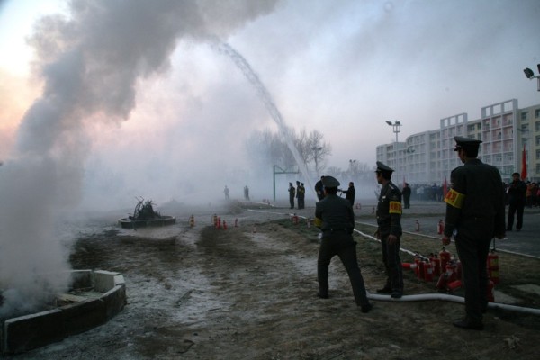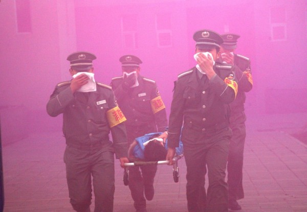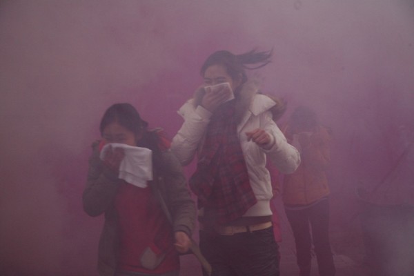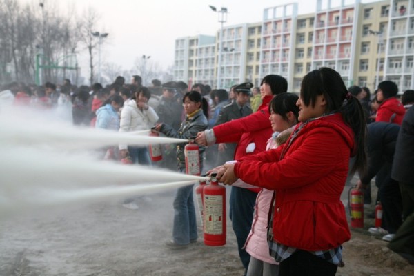 16:30警報長鳴,煙霧滾滾,消防演習正式開始。2000多名新生以毛巾掩面,有秩序地從煙霧中穿過。模擬現場非常逼真,給人以身臨其境的感覺。四名保安人員還現場模擬了火場救護。之后,參演學生在生活區前操場集合,徐進團警官現場講解了滅火器的使用方法后,部分學生和后勤人員饒有興趣地在四個火堆前親身體驗了滅火器的使用。最后保安人員用消防水帶將火堆撲滅。