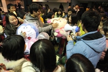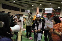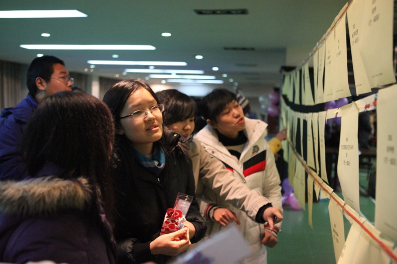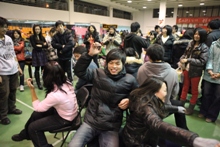 看,那個戴黑框眼鏡的男生,好像在尋找什么人。“找阿迪!”原來是經濟學院的“配對”游戲,這哥們兒拿到的標簽上寫的是“NIKE”!要是能找到拿“阿迪”的同學,他倆就可以領取一份小獎品了。除了“配對”搞得大家滿場找人外,經濟學院的“8人解套”游戲也吸引了一撥又一撥的同學前來參與。