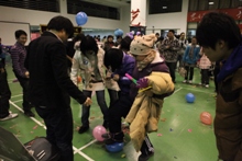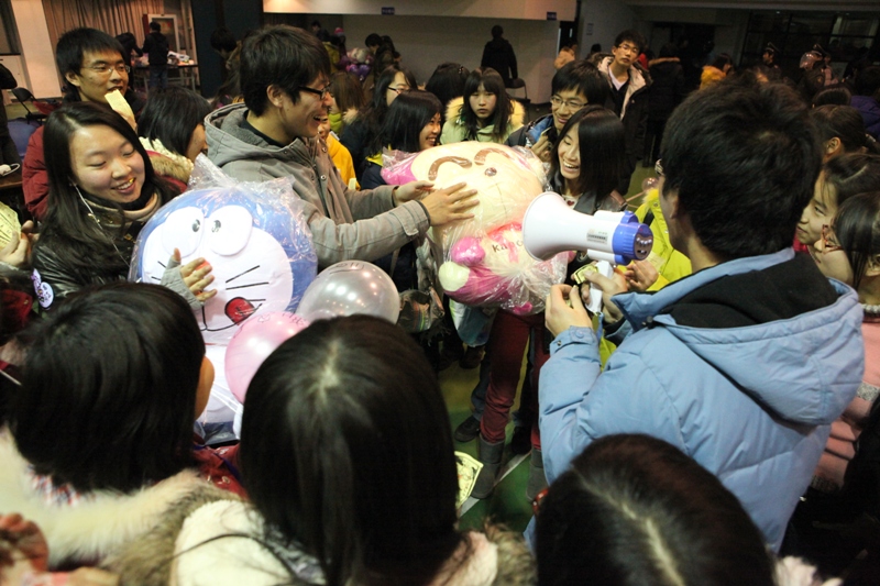 “彩燈亮閃閃,同學圈圈轉”,這是機械學院的“搶椅子”游戲。架子鼓也來助陣,熱鬧、歡快,那場面只能用一個詞形容:相當火爆!這邊搶椅子,那邊倆人一組,一個人描述特征,一個人猜內容。配合默契者眼神交換,喜悅滿面;稍微差點的,領了禮物趕緊奔赴下一個“戰場”。