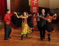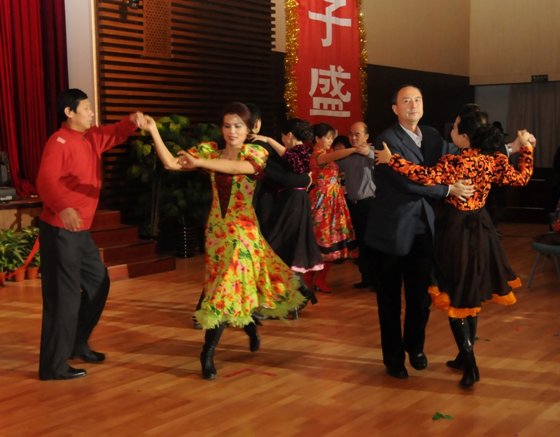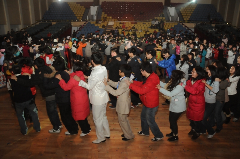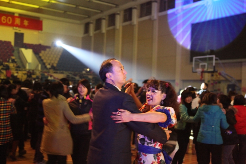 交誼舞、街舞、斗舞、現代舞;民族歌、流行歌……豐富多彩的節目掀起一個又一個高潮。通過交誼舞社簡單的示范后,在場觀眾兩人一組進入舞池,伴隨著悠揚的樂曲翩翩起舞。最后的多人現代舞帶動起全場的高潮,還在座位上的觀眾按捺不住激情紛紛進入舞池與舞者一同跳舞。盧思鋒副書記與眾多老師再次進入舞池,隨著歡快的節奏將華爾茲優美的韻律再次展現給大家。最后,現場的所有觀眾及工作人員伴隨著兔子舞的音樂在舞池內圍成一個多層的大圈,歡快的跳動著。