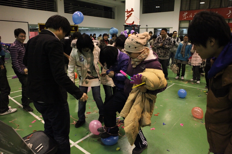看這邊,“藝”和“傳”兩個大字下面圍著一堆“套圈迷”,每人三次機會,蘋果、筆、手機鏈……想要什么,套走!當然你的套圈水平,很重要。倆人把腳捆一起,然后踩氣球,這個應該沒難度,歡聲笑語連不斷,氣球響響過新年。
