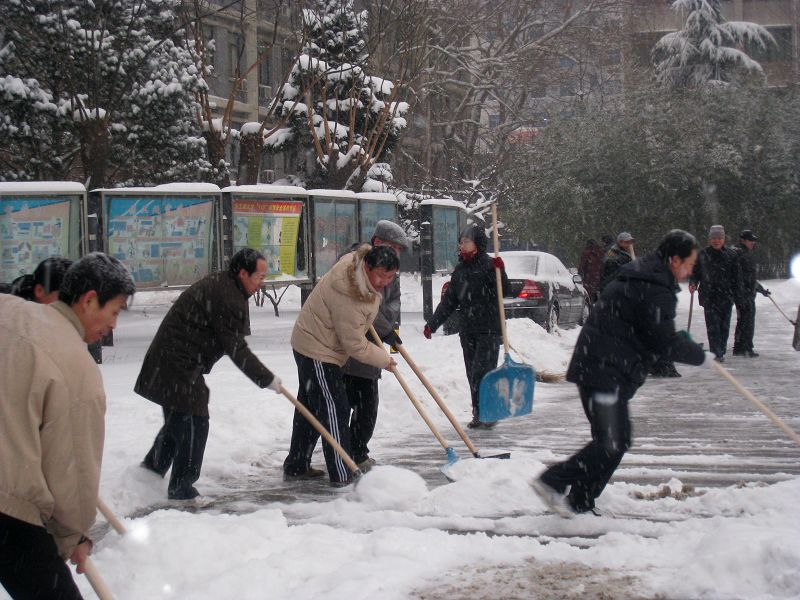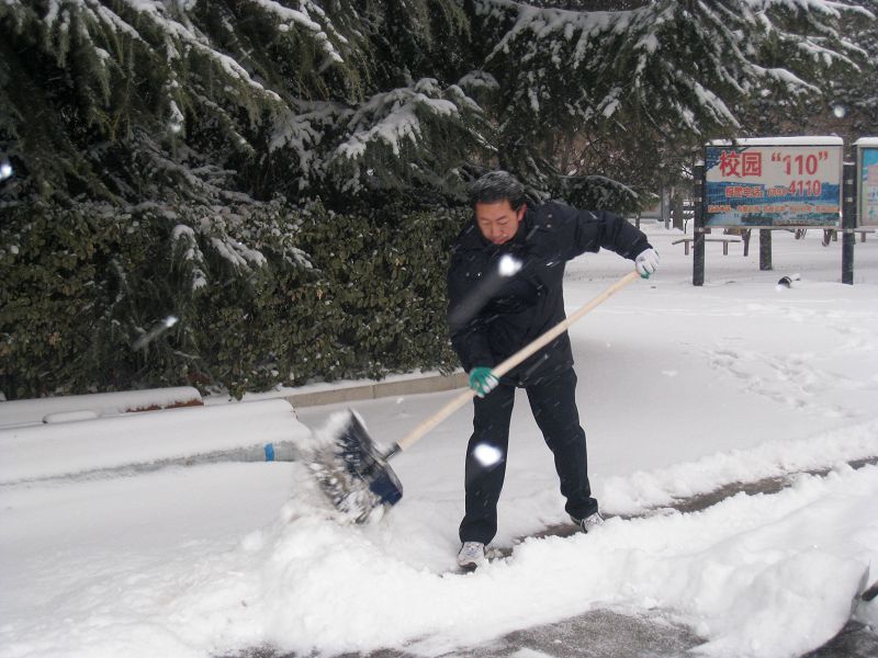 由于降雪沒有停,為保證節后師生員工的出行安全,后勤號召大家發揚不怕疲勞、連續作戰的精神,要求全體員工4日早7點上班,全部投入到掃雪工作中,全力迎接新年的第一個考驗。有的家遠同志擔心路滑不好坐車,早上六點就出家門,顧不上吃早飯。有的同志前一天掃雪感冒了,還是堅持參加掃雪。校門口值班的保安也一同幫助掃雪。