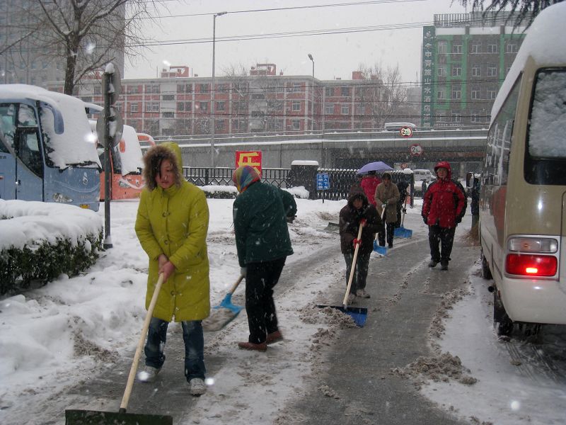 2日21時左右,后勤處領導及物業中心負責人就開始電話通知:啟動學校掃雪鏟冰工作預案,按預先劃分的責任區、責任人,及時開展阜成路、良鄉校區的掃雪鏟冰工作。3日早上5點,物業中心的保潔員就開始在阜成路校區、家屬區掃雪,6點公寓值班的同志開始打掃學生宿舍門前積雪,7點物業中心的其他員工也加入到掃雪的行列中。下午3點多,在后勤主管校長呼文亮、后勤處處長魏冰、副書記張建平、副處長盧燦寬、尹寶星的帶領下,后勤處、綜合中心、物業中心、維修中心、公寓中心、飲食中心、運輸中心的100多名職工,紛紛趕往學校,陸續投入到掃雪隊伍中。盡管天氣寒冷,但大家干勁十足,紅彤彤的臉上掛滿了汗水和雪水,直到天色漸黑,大家才回家吃飯。