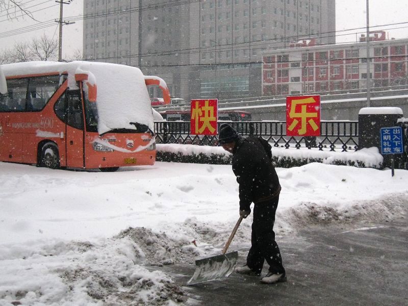 1月3日,北京普降大到暴雪。后勤工作人員在副校長呼文亮、后勤處處長魏冰等領導的帶領下,不畏嚴寒,積極掃雪,確保了節后師生員工的出行安全。