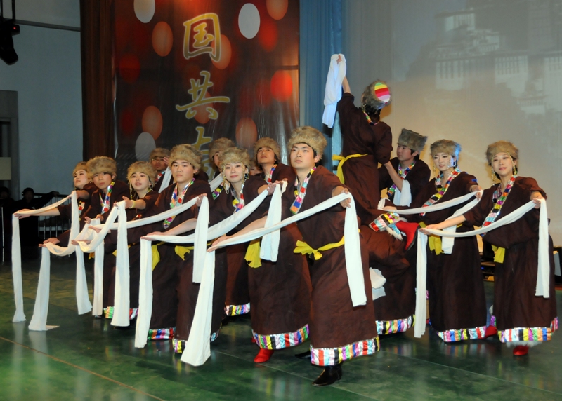 棕色的藏袍,天藍色的藏裙,沖滿濃郁藏地風情的樂曲仿佛把現場觀眾帶到了美麗的青藏高原,帶到了神圣的布達拉宮之前。經過近百次的排練,校舞蹈團的同學們帶來了民族舞蹈《神往》。每個人手捧潔白的哈達,美麗的藏族姑娘從人群中歡跑而出。長長的水袖仿佛成了舞者們連接天際的工具。觀眾還沉浸在其中,然而伴隨著清脆的鳥鳴和潺潺的水聲,舞蹈卻已經定格在了結束的畫面。