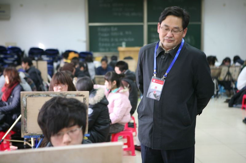 張德玉和李朝鮮詢問了報名人數、考試安排,查看了考場并慰問了現場負責考務的老師。招生辦老師向到場的學校領導匯報了考生考試情況。教務處處長張曉堂因擔心考生擠在一起作畫太拘束,建議盡量將考生安排在大教室。