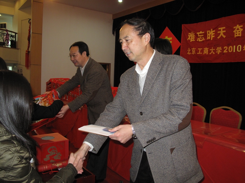 在歌唱祖國的樂曲聲中,盧思鋒、呼文亮向留校學生贈送了節(jié)日禮品、慰問金、餐券和電話卡。學校辦公室主任吉濤、商學院黨總支書記龐毅、傳媒學院黨總支書記秦巍、外語學院黨總支書記閆冀生、保衛(wèi)處處長頓勁松、宣傳部副部長袁小年、團委書記呂良、后勤處副處長尹寶星等同志分別為同學們抽取發(fā)放了新年賀卡和由團市委提供的錦囊禮包。
