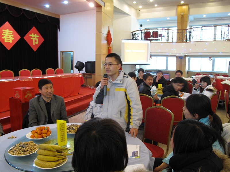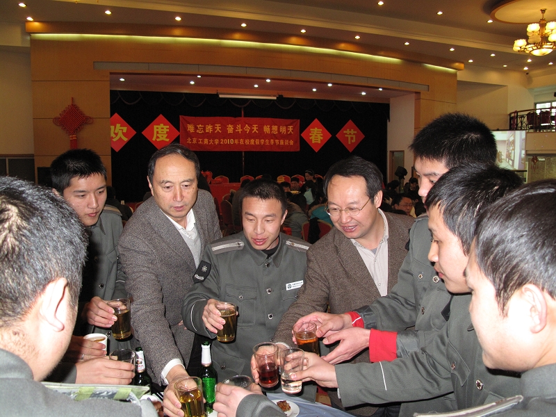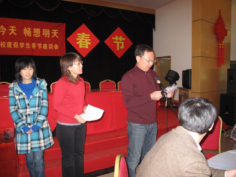 盧思鋒在致辭中代表黨委書記孫堯東、校長潭向勇向在校度假同學表示節(jié)日祝福,向仍然工作在第一線的同志表示節(jié)日的問候,他看到留校學生中有幾位參加過北京奧運會志愿服務和國慶60周年群眾游行活動的同學時高興的說道:希望同學們向參與北京奧運會、國慶60周年慶典活動一樣關心參與學校60周年校慶活動。祝同學們假期愉快!。呼文亮在隨后舉行的節(jié)日午宴上致祝酒辭,他祝愿全校師生虎年生活更加美好!