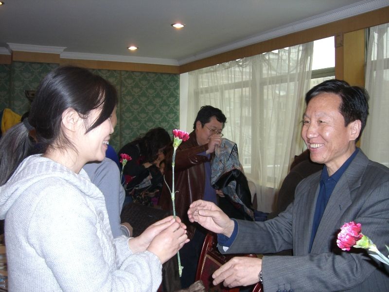 院班子和全體女教師舉行了聯誼會,4位女教師在良鄉上完1-2節課,就冒雪乘公交返校,為的是要親耳聆聽4位男性領導特意為百年“三·八”編制的詩朗誦。李寶仁書記向每一位女教師獻上康乃馨,祝女教師身體健康;楊德勇院長為每一位女教師系上絲巾,送去學院黨政工的溫暖。聽到書記院長等領導聲情并茂的朗誦,女教師們露出自豪開心的笑容。