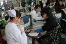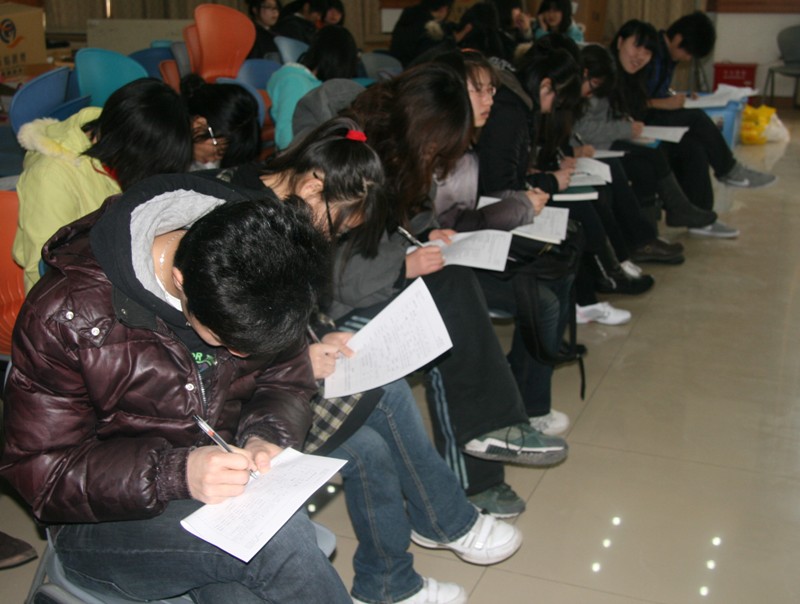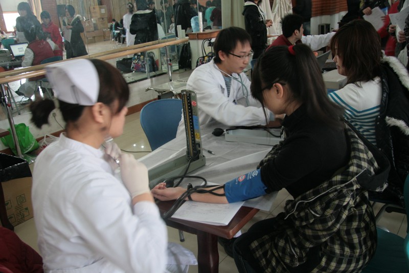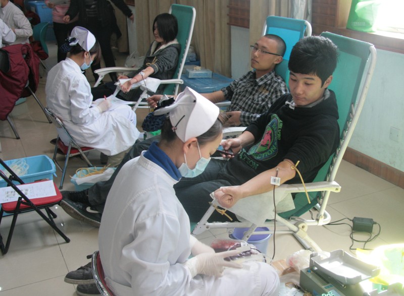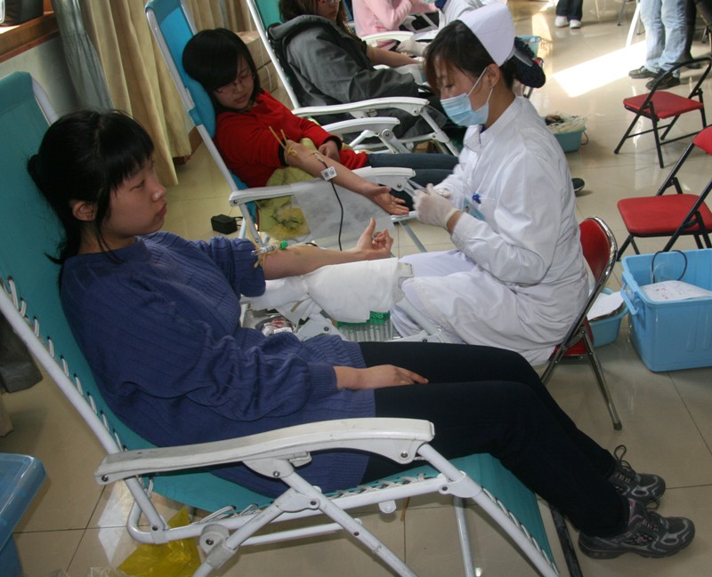 此次活動于上午9時在學(xué)生活動中心多功能廳開始。但很多同學(xué)都提前趕來等候,他們在工作人員的指導(dǎo)下填寫信息采集表。測脈搏、稱體重、驗血、采血各個環(huán)節(jié)有條不紊地進行著。采血的同學(xué)在醫(yī)生的指導(dǎo)下有節(jié)奏地做著手部握拳、伸張活動,鮮血隨著手掌的屈伸緩緩流入血袋中。一些同學(xué)因未達到采血標(biāo)準(zhǔn)體重或是感冒而未通過體檢。
