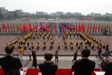 長扇輕舞,悠揚而不流于激越;長拳搏擊,剛毅而不流于粗鄙;紅傘跳躍,鮮活而不流于媚俗。巨幅“六十”字樣在“紅印象,映工商”的主題下更加耀眼璀璨!
