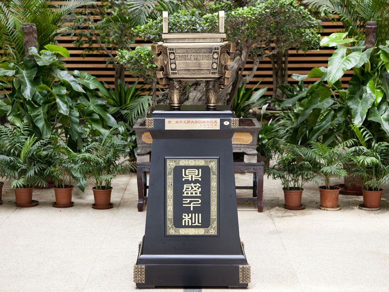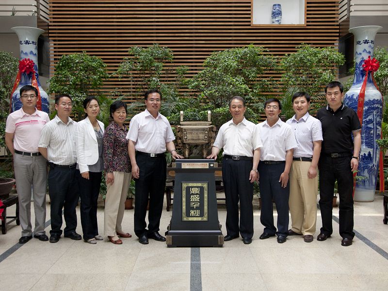 工作交流結(jié)束后,孫堯東同志和來賓在“鼎盛千秋”寶鼎前合影留念,并陪同參觀學(xué)校圖書館和文科實踐中心。