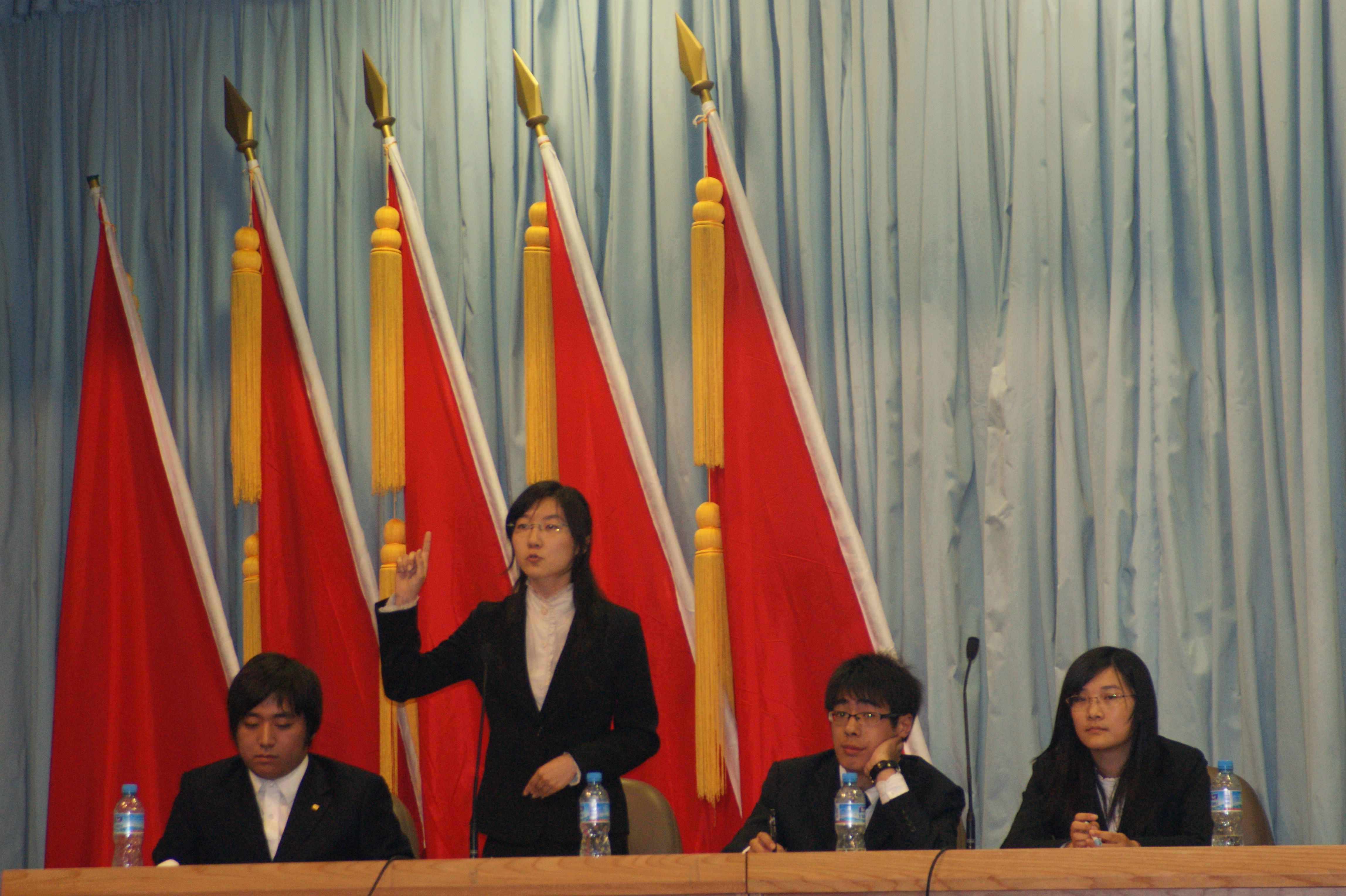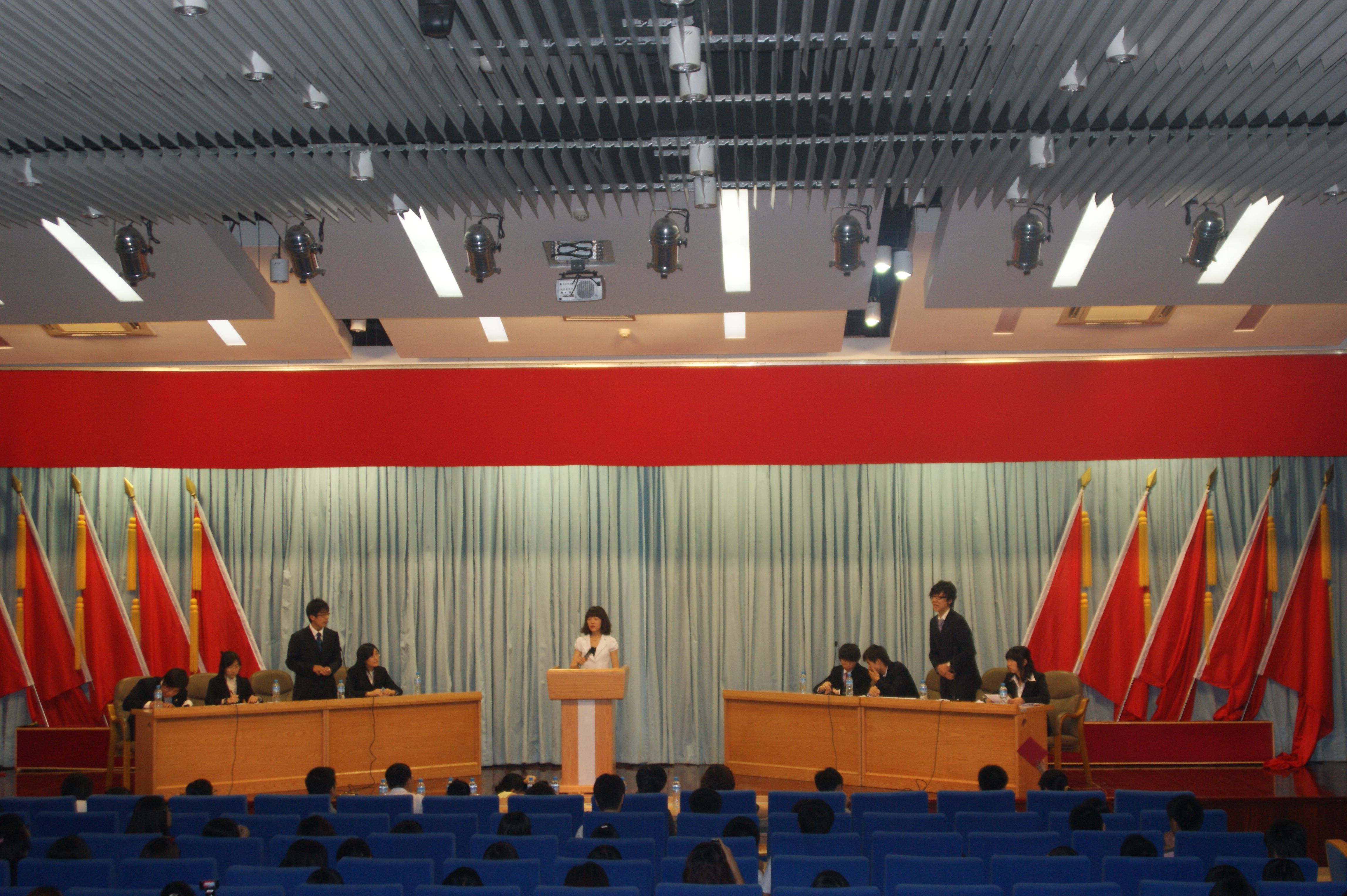 本屆“春季杯”辯論賽以“慶六十年校慶,建綠色低碳校園”為主題,法學院辯論隊與經濟學院辯論隊過關斬將,最終殺入決賽。雙方此次辯論的話題是:就當今中國而言,法制健全與經濟發展誰更重要。法學院(正方代表隊)觀點是:就當今中國而言,法制健全更重要。經濟學院(反方代表隊)觀點是:就當今中國而言,經濟發展更重要。