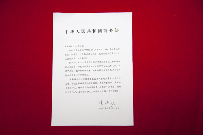 值此北京工商大學建校60周年之際,謹向貴校全體師生員工和海內(nèi)外校友致以衷心祝賀!我因?qū)脮r在外出訪,無法出席慶典,特致歉意!