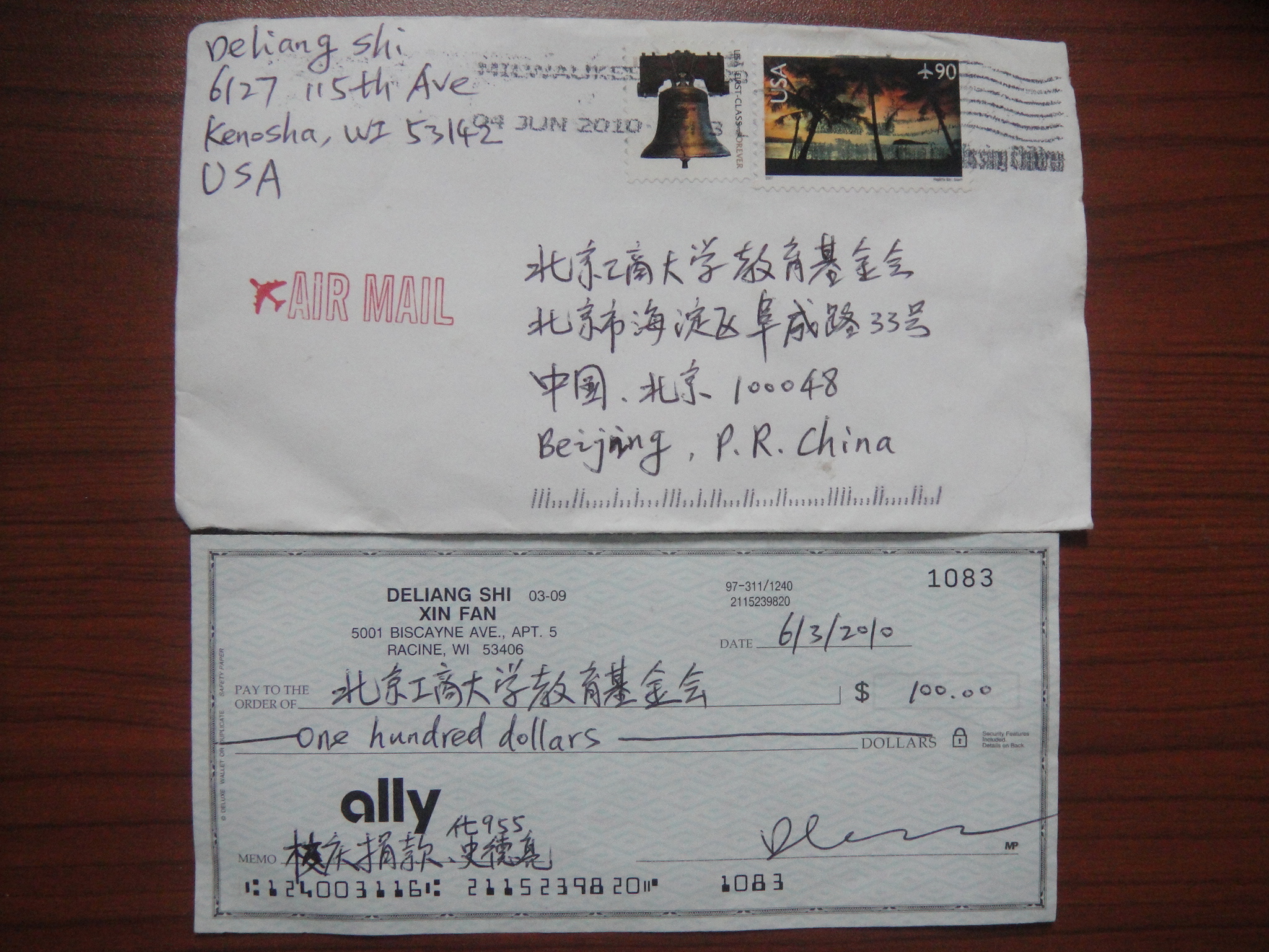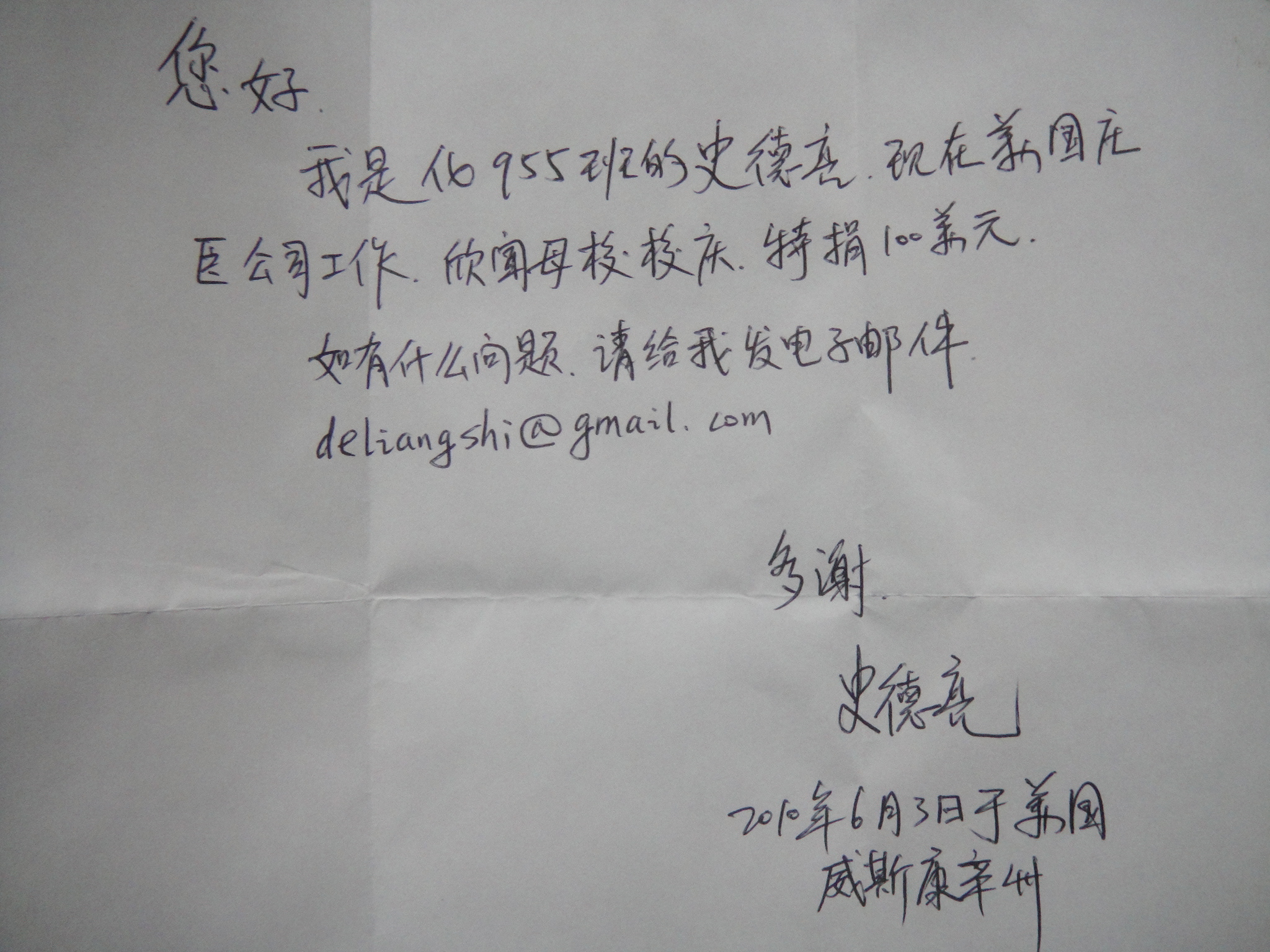 629,學校教育基金會收到一封來自美國威斯康辛州的信。這是化955班的史德亮校友從網上得知母校60年校慶后,特寄來賀信和100美元支票。