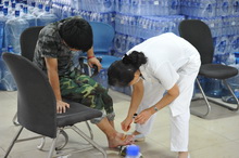 校醫院副院長蔡冶詳細介紹了此次軍訓的醫務安排:“這是學校第一次校內軍訓,校醫院對此十分重視,特意抽調阜成路、良鄉兩個校區的醫務人員組建軍訓急救隊,全力完成醫護任務。為此,校醫院做了充分的準備工作。這次醫務隊在開訓前準備了多種醫療器械,大量藥品,充足的氧氣以及用以補充體力的葡萄糖,可以說醫療儲備十分充分,足以應對各種突發狀況。而軍訓急救站也是校醫院為配合本次學生軍訓活動臨時組建起來的,總共有6位醫務人員,且實行輪班制。每天有四位醫生留守在校醫室,兩位作為急救人員駐守在訓練場地旁的急救站。”