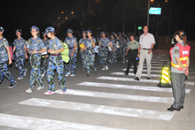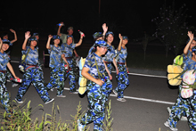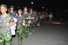 夜幕降臨,整個軍訓團卻士氣高昂,一面面迎風招展的營連旗引領著隊伍在夜色中不斷前進。軍訓團總指揮、黨委副書記盧思鋒,軍訓團團長呂彥華中校,學生處處長兼軍訓團政委呂素香,保衛處副處長兼軍訓團副團長陶偉,軍訓團副團長徐紅京,團委書記、軍訓團副政委呂良,軍訓團參謀長郭建榮,各學院輔導員以及所有參訓官兵陪同參訓學員一起走完全程。
