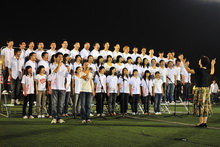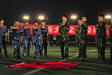 除了獨唱,還有全體教官和聲清唱的歌曲《精忠報國》,充滿激情的指揮官揮動著雙臂,當教官們渾厚低沉的嗓音響起,學生們不約而同打著拍子,還有不少同學紛紛站起身拿出手機錄下這一時刻。歌曲結束后,學生們各自高喊本營的名字,全場的氣氛被推向高潮。