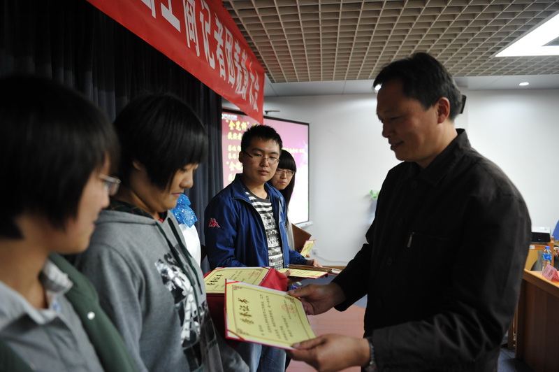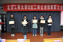 黨委宣傳部副部長(zhǎng)袁小年宣讀《關(guān)于表彰日出工商記者團(tuán)優(yōu)秀學(xué)生記者的決定》。日出工商記者團(tuán)是北京工商大學(xué)一支優(yōu)秀的學(xué)生社團(tuán)。幾年來(lái),在黨委宣傳部的領(lǐng)導(dǎo)下,日出工商記者團(tuán)已迅速成長(zhǎng)為校園生活的記錄者,學(xué)校改革的宣傳者,社會(huì)主義價(jià)值觀的捍衛(wèi)者。特別是在我校60周年校慶、2009、2010級(jí)學(xué)生軍訓(xùn)新聞報(bào)道中,學(xué)生記者以文字、圖片、視頻、廣播等多種形式全方位、多視角、立體化地展示了活動(dòng)盛況,展現(xiàn)了我校師生良好的精神風(fēng)貌,同時(shí),也展現(xiàn)出了日出工商記者團(tuán)積極向上的奉獻(xiàn)精神,展現(xiàn)出了日出工商記者團(tuán)訓(xùn)練有素的業(yè)務(wù)素養(yǎng),展現(xiàn)出了日出工商記者團(tuán)后繼有人的蓬勃態(tài)勢(shì)。為繼承日出工商記者團(tuán)光榮歷史,激勵(lì)新一屆日出工商記者團(tuán)成員再創(chuàng)輝煌,特對(duì)日出工商記者團(tuán)表現(xiàn)優(yōu)秀的學(xué)生記者進(jìn)行表彰。授予13名資深記者“突出貢獻(xiàn)獎(jiǎng)”、15名優(yōu)秀文字記者“金筆桿”獎(jiǎng)、3名優(yōu)秀攝影記者“金鏡頭”獎(jiǎng)、13名優(yōu)秀攝像記者“金影像”獎(jiǎng)、38人“積極參與獎(jiǎng)”(名單見(jiàn)附件)。在歡快的樂(lè)曲聲中,獲獎(jiǎng)學(xué)生記者依次臺(tái)上,從領(lǐng)導(dǎo)手中接過(guò)金燦燦的榮譽(yù)證書(shū)和獎(jiǎng)品。相機(jī)咔咔聲不斷,現(xiàn)場(chǎng)氣氛越發(fā)熱烈。